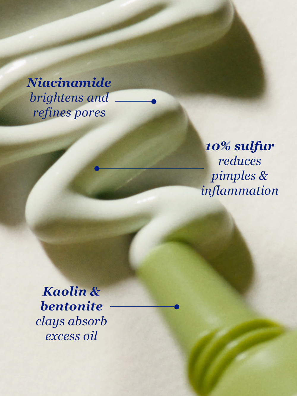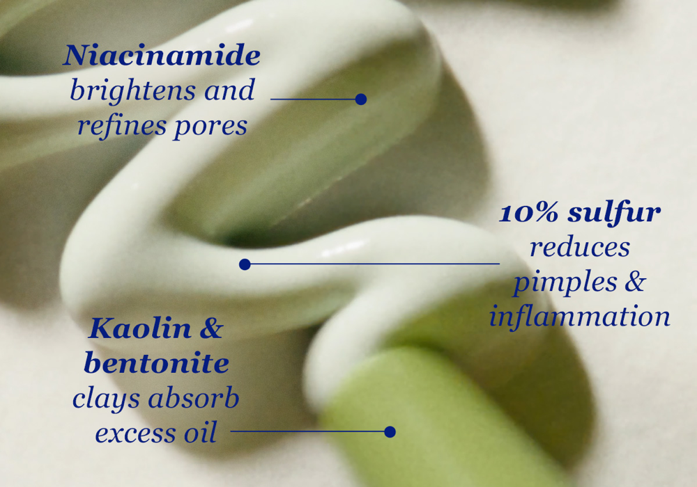 Sulfur 10%, Aqua/Water/Eau, Glycerin, Kaolin, Bentonite, Propylene Glycol, Niacinamide, Sorbitol, Titanium Dioxide (CI 77891), Phenoxyethanol, Hamamelis Virginiana (Witch Hazel) Water, Acacia Senegal Gum, Xanthan Gum, Alpha-Glucan Oligosaccharide, Carbomer, Polyglyceryl-4 Caprate, Polyglyceryl-6 Caprylate, Chromium Oxide Green (CI 77288), Butylene Glycol, Potassium Sorbate, Sodium Benzoate, Glycyrrhiza Glabra (Licorice) Root Extract, Salix Nigra (Willow) Bark Extract, Camellia Sinensis (Green Tea) Leaf Extract, Benzoic Acid.*We don’t use any potential pore-clogging or Malassezia folliculitis (fungal acne) triggering ingredients.